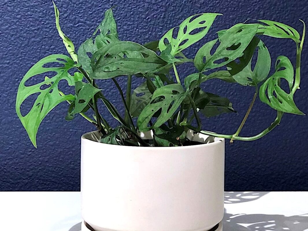 Monstera adansonii is a unique, easy-to-care-for vine houseplant. It is nicknamed the “Swiss cheese plant” for its pointed perforated heart-shaped leaves with big holes.