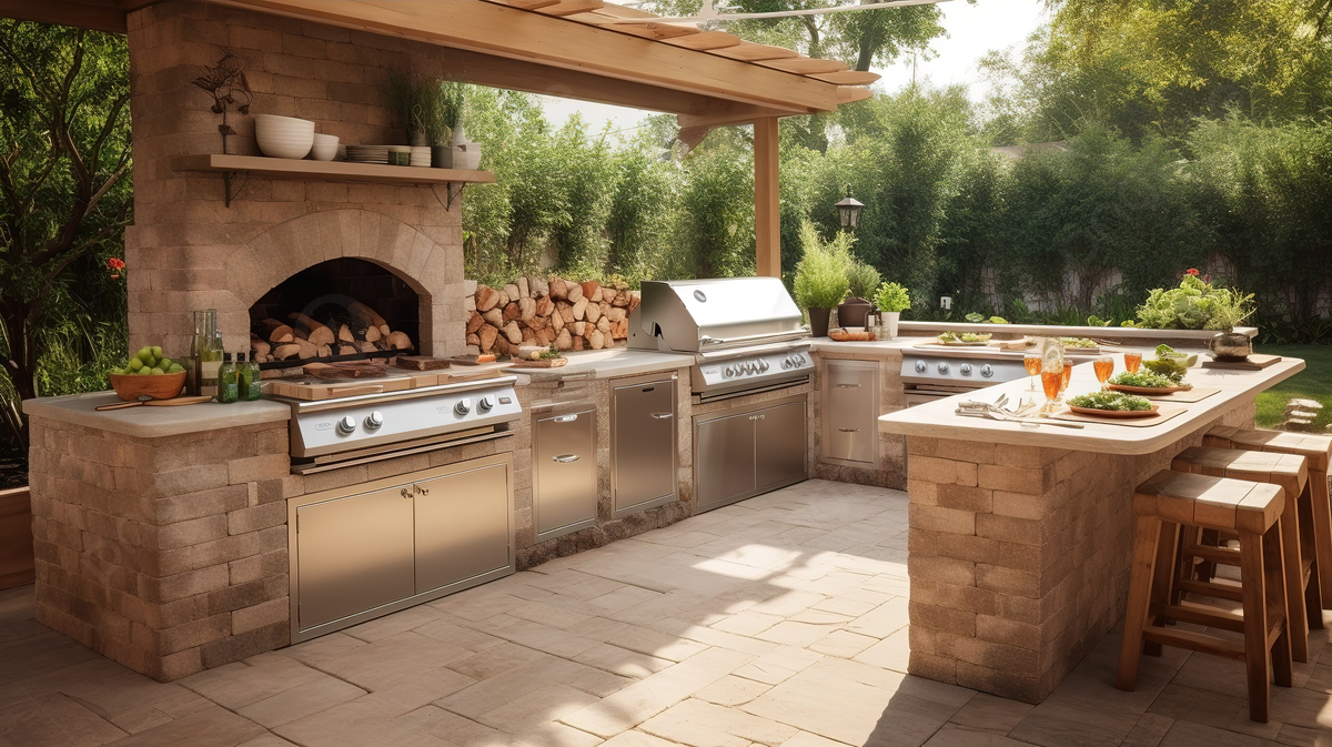 A built-in grill or pizza oven as the focal point.