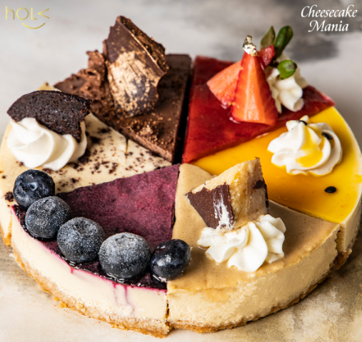 It contains slices of Blueberry Cheesecake, Gold Class Cheesecake, Oreo Cheesecake, Passionfruit Cheesecake, Snickers Caramel Cheesecake, and Strawberry Cheesecake.