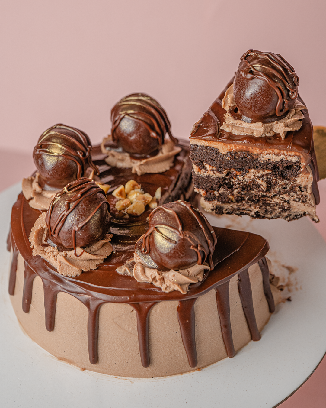 ganache drip. Crowned with handcrafted chocolate truffles and swirls of hazelnut